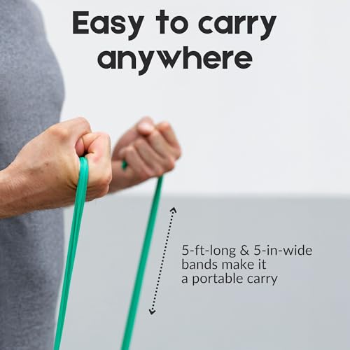 Each band measures 5 Foot long X 5 Inch wide and comes in three color-coded resistance levels: Yellow-3-4.3 lbs.; Red-3.7-5.5 lbs.; Green-4.6-6.7 lbs.