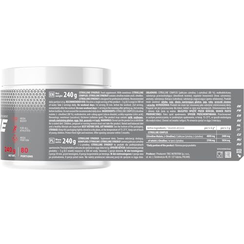 Supplement Facts: Serving Size: 3g Servings Per Container: 80 Amount Per Serving: Citrulline Complex [Citrulline Malate, L-Citrulline] 2400mg of which L-Citrulline 1854mg Citrulline Synergy Other Ingredients: CITRULLINE COMPLEX [citrulline malate; L-citrulline) (80.0%); maltodextrin; anti-caking agent – silicon dioxide; acidity regulator – citric acid; aromas; sweetener – sucralose; thickener – cellulose gum. Citrulline Synergy Recommended Use: Dissolve a single serving of the product – 3 g (0.5 scoops) in 300 ml of water. Use 2 servings a day. On training days: 1st serving 30 min. before training, 2nd serving immediately after training. On non-training days: 1st serving in the morning after getting up, 2nd serving at bedtime.