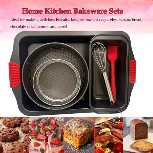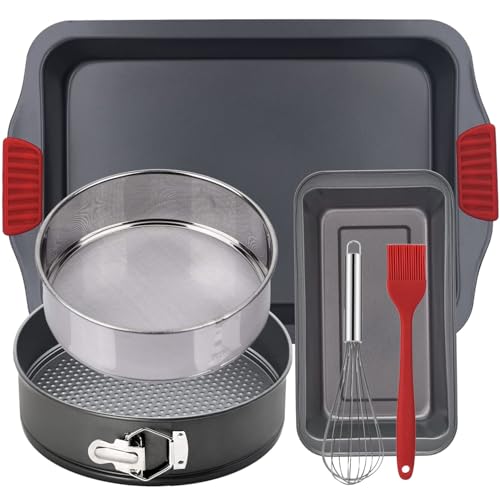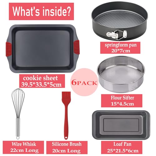 6-Piece Baking Tray Set Non Stick Bakeware,Oven Baking Pan,Springform Cake Tin,Loaf Pan,Flour Sifter, Stainless Steel Whisk, Silicone Basting Brush