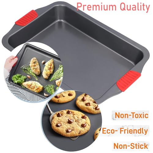 High quality carbon steel cookie sheet with heat resistant red silicone handles for comfortable use.