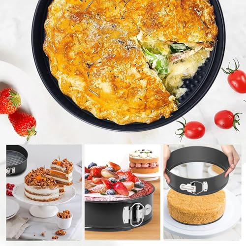 Round baking tray has a spring-loaded latch and interlocking mechanism that securely holds the cake moulds together and provides a tight, leak-proof seal.