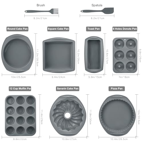 Non-Stick & Heat-Resistant—– Temperature safe from -40 to +446℉/ (-40 to +230℃); tasteless, safe for oven, microwave, dishwasher, fridge, freezer. Easy to release and clean, feel free to enjoy healthier desserts with family and friends. Meet Your Need—– 9pcs baking tray set: Donut pan x 1, Toast pan x 1, 12 Cup muffin pan x 1, 9 inch Round cake pan x 1, 8 inch Square cake pan x 1,Fluted pan x 1,Pizza pan x 1, brush x 1, spatula x 1