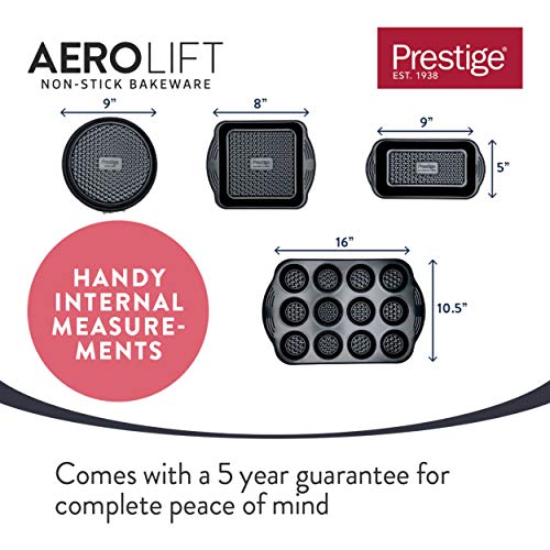 PRESTIGE, Aerolift, 4 Piece Bakeware Set, Non stick, Cushion Base, Fridge Freezer & Dishwasher Safe, Carbon Steel, 9 Springform Tin, 8 Square Cake Tin, 12 Cup Muffin Tin, 9 x 5 Loaf Tin, 4 Piece Set
