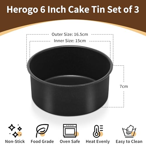 SAFE & HEALTHY: Herogo 6inch round cake tin made of food grade stainless steel core with non-stick coating, Better rustproof and corrosion protection for long time use, No worry about harmful substances release into food, Ensure safe and healthy for daily baking use