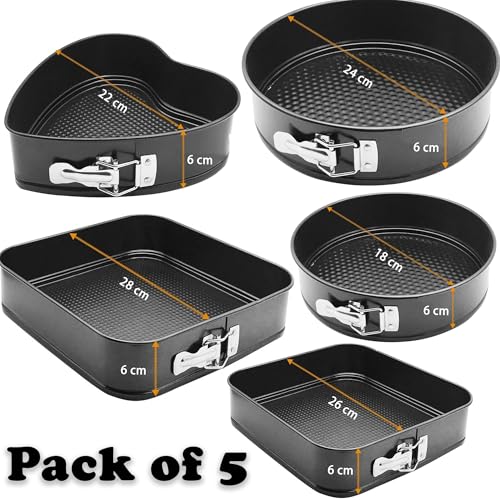SAVOURLUXE Springform Cake Tins Heavy Duty – Pack of 5, Double Layer Non-Stick Coating, Removable Base, Heavy Duty Carbon Steel, Super Endurance – Round, Heart, Square Cake Tins for Baking (5)
