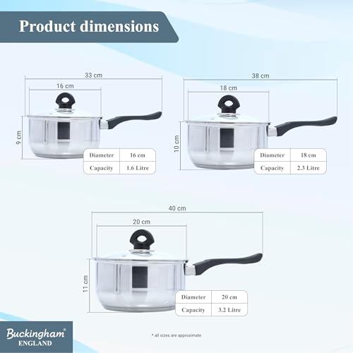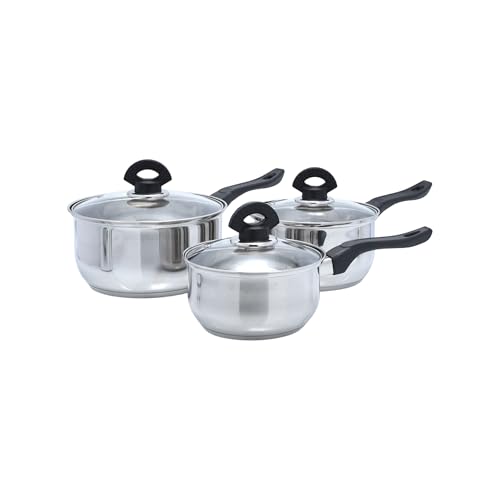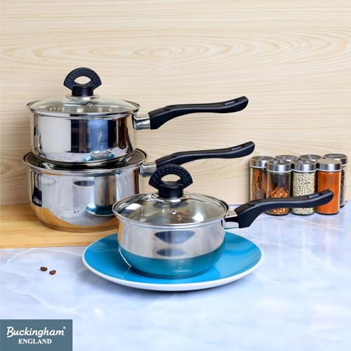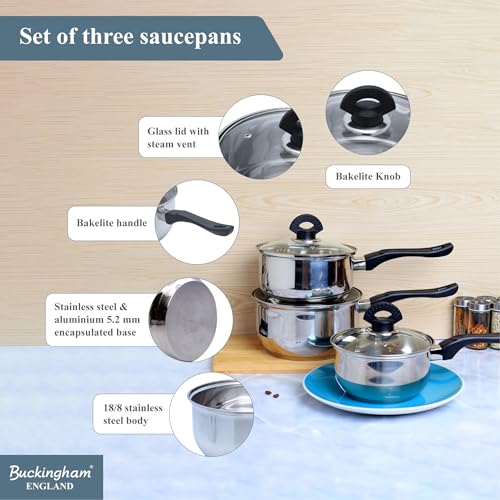 Buckingham Premium 3 Pieces Saucepans Set with Glass Lid Stainless Steel Bakelite Handles and Even Heat Distribution