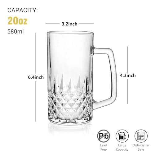 Sturdy Design: Our handle design of the 580ml beer glasses is easy to pick up and put down, not heavy with beer full inside. These beer glases with handle feature an ornate body with delicate patterned glass cuts, making it a perfect choice for entertaining.