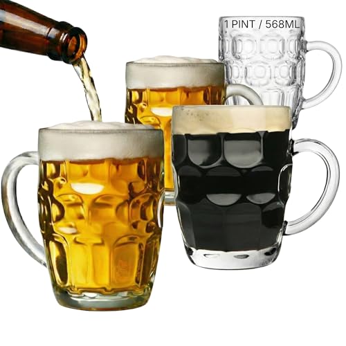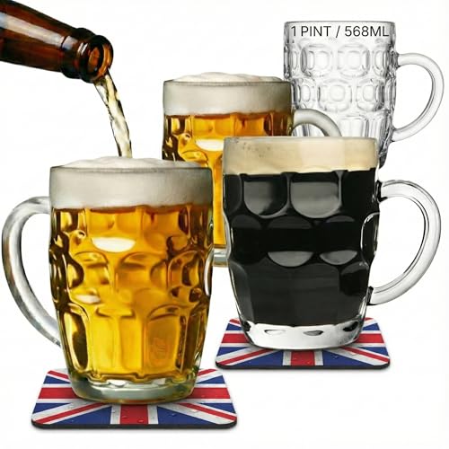 Drinkstuff Great British Pint Glass Tankards – Set of 4 Dimpled Glass Mugs with Handle, 568ml Pint Glasses for Beer, Ale & Lager – Dishwasher Safe, Gift Boxed