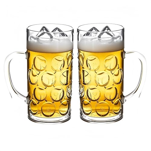 Plastic Beer Glasses 2 Pint, Set of 2 Clear Large Beer Mugs with Handles, Reusable Beer Stein Drinking Cups for Club, Bar & Party