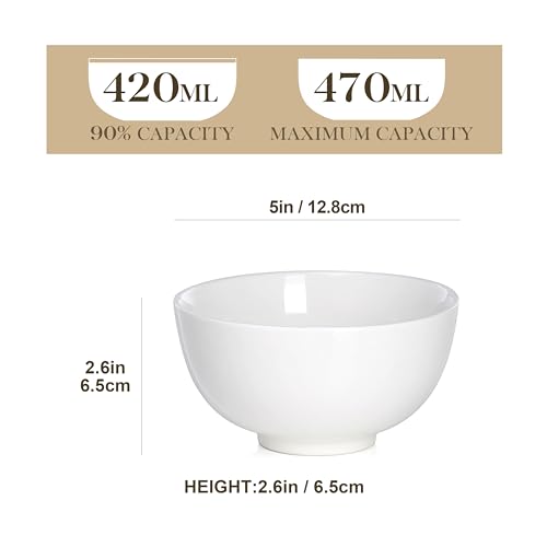 【CLASSIC DESIGN】Small Bowls Set of 8. 90% Capacity: 420ML. Maximum Capacity: 470ML. Dimensions (each): 12.8×6.5 cm/ 5×2.6 inch. The small bowl set impresses with its ecological design with ivory white porcelain in a round shape. The new designed ivory white tone and classic round shape design make great all-purpose restaurant style bowl, the dessert bowls not only ideal for preparing delicious muesli and fruit, but also perfect for serving rice, ice cream etc.