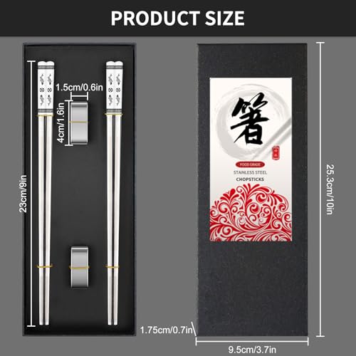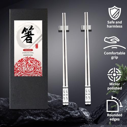 【Premium Healthy Material】The stainless steel chopsticks and holders are made from food-grade 304 stainless steel, offering durability, corrosion resistance, and heat resistance, ensuring a healthy and safe dining experience with these metal chopsticks.