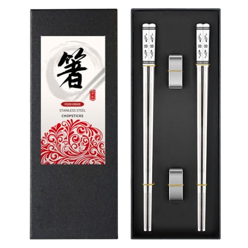2 Pairs Metal Chopsticks – Stainless Steel Chop Sticks, Comes with Two Holders – Reusable & Dishwasher Safe, for Japanese Chinese Korean Kitchen & Dining (Gift Box)