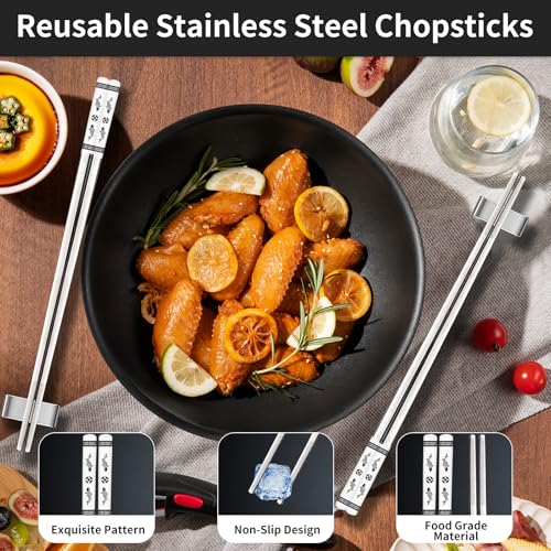 【Easy to Clean, Durable, and Eco-Friendly】Made from stainless steel, these reusable chopsticks are mold and bacteria resistant, dishwasher safe, and won’t wear out or deform, making them the perfect replacement for traditional wooden chopsticks.