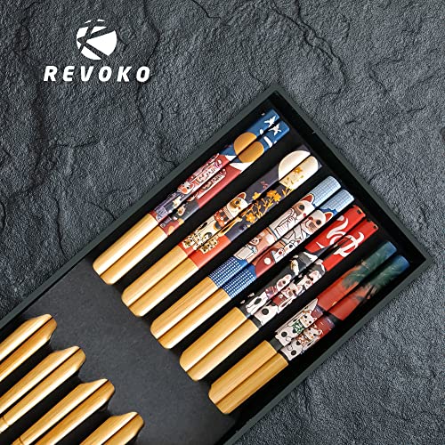 Bamboo Chopsticks – Premium 5-Pack Japanese Reusable Chopsticks with Fortune Cat Print – Natural Food-Grade Chop Sticks for Sushi, Asian Dishes (Fortune Cat Print)