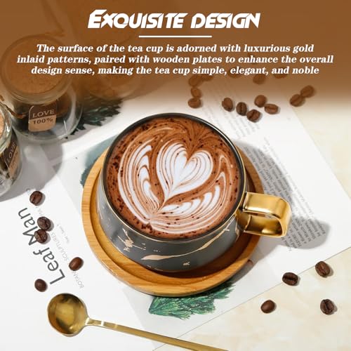 Exquisite design: The surface of the teacup has a luxurious golden inlaid pattern with a wooden saucer to elevate an integral sense of design,making the teacup simple,elegant and noble