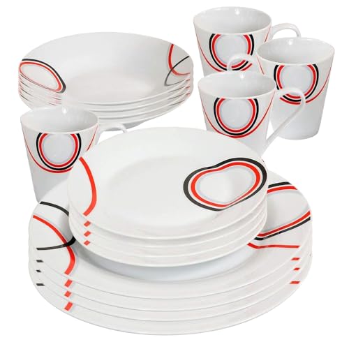 16 Piece Dinner Set – Red & Black Patterns Dinnerware Set | 4 Bowls, 4 Side Plates, 4 Mugs, 4 Soup Plates | Kitchen Microwave & Dishwasher Safe – for Cereal, Desserts, Porcelain Cup, Gift