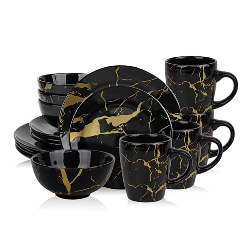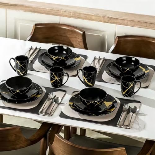 Alivio 16-Piece Premium Porcelain Dinnerware Set – Black & Gold Marble Design, Scratch-Resistant Luxury Tableware Collection