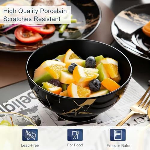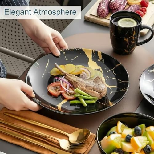 Luxurious Black & Gold Marble Design: Featuring a stunning black glossy surface with elegant gold marble veining, this set adds instant sophistication to any table. The premium pattern is embedded into the glaze, ensuring the design won’t fade, wear off, or lose its shine over time. A visually rich and modern design that elevates every dining setup—from casual dinners to festive gatherings.