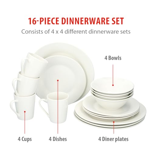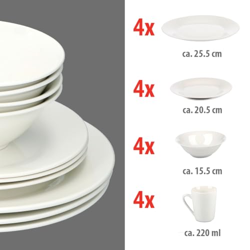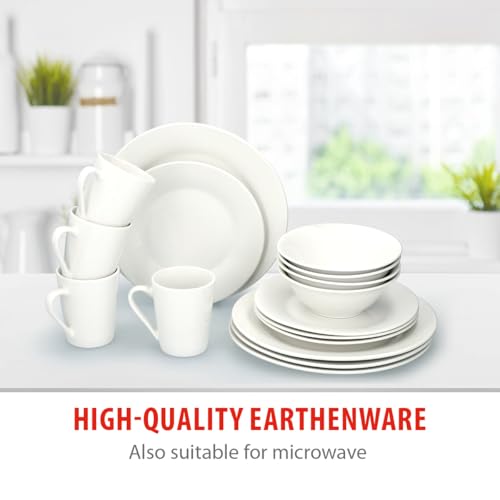 alpina Dinner Set for 4 People – Plates and Bowls Set – Earthenware Tableware – Dinner Plates, Dessert Plates, Bowls and Mugs – Microwave and Dishwasher Safe – White