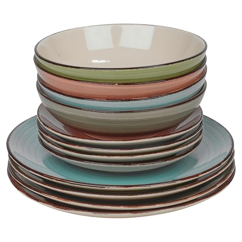 URBNLIVING Coloured Stone Glazed Ceramic Dinnerware Set – 12 Pcs Crockery Plates & Bowls – Assorted Colours – Green, Blue, Grey, Pink – Fridge & Dishwasher Safe