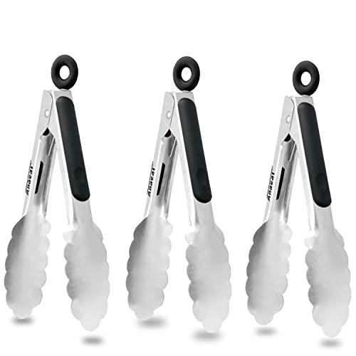 Anaeat 3 Pack 7″ Mini Stainless Steel Cooking Tongs – Sturdy Coiled Spring Locking Kitchen Food Tong with Non-Slip Silicone Grip for Serving, Cooking, Baking – Heat Resistant up to 480°F (Black)