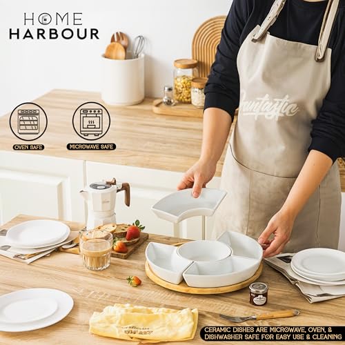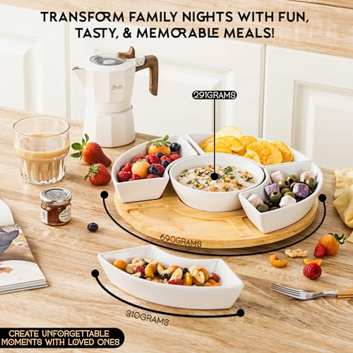 Rotating Serving Platter | 5-Section Divided White Ceramic Bowls on Bamboo Lazy Susan | Turntable Dip Set with Removable Dishes for Hosting, Sharing Snacks, Nacho, Taco Bar, and Parties