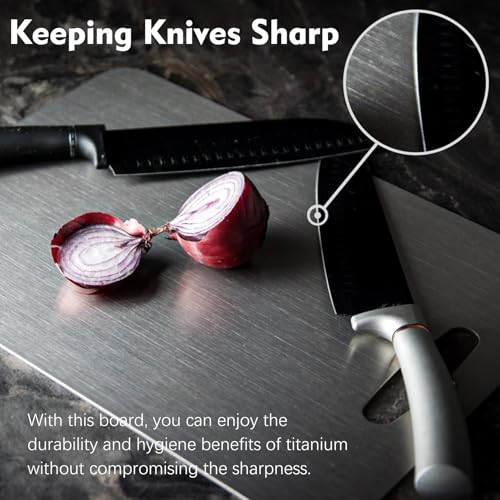 【🔪Preserves Your Knives’ Sharpness Longer】Unlike cutting boards made of stone, glass, or steel – which are particularly harsh on your blades – titanium is three times softer than the steel used in 99% of kitchen knives. This means that titanium chopping board will not damage or dull your knives as quickly as stone, steel, or glass options because they’re much harder. With this board, you can enjoy the durability and hygiene benefits of titanium without compromising the sharpness.