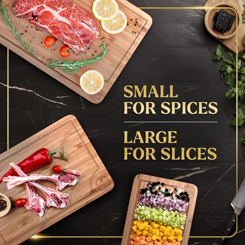✔ SMALL FOR SPICES, LARGE FOR SLICES – THE PERFECT FIT: From mincing garlic and chili to carving roasts and slicing meats, this 3-piece bamboo chopping board set is designed for every kitchen task, big or small.