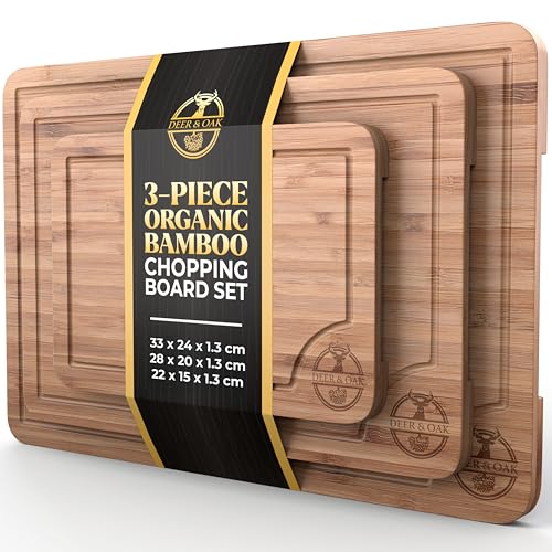 Deer & Oak 3-Piece Bamboo Chopping Board Set, Pre-Oiled Wooden Cutting Chopping Boards for Kitchens 33x24cm, 28x20cm, 22x15cm, with Side Handle and Grooves