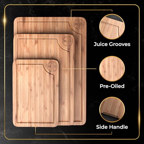✔ GENTLE ON KNIVES, TOUGH ON KITCHEN TASKS: Made from premium bamboo, these cutting boards help preserve your knives’ sharpness while standing up to heavy chopping and slicing. A sustainable, long-lasting alternative to plastic boards.