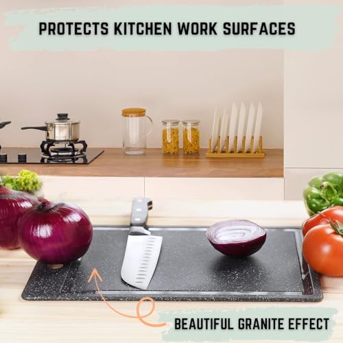 Thick and Durable. Non-Slip and Sturdy Design: Each chopping board features non-slip feet that keep the boards securely in place while you’re slicing and chopping. The stable surface prevents slipping or sliding, making your food prep safer and more efficient, especially when working with sharp knives. The Chopping Boards are all 0.9 cm thick making it durable and hard wearing. They all feature a flat side and a grooved side to catch juices. This prevents the juices from draining onto your countertop keeping your countertop clean and tidy.