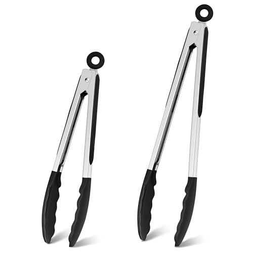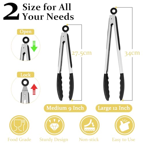 Homikit Kitchen Tongs Set of 2, Stainless Steel Food Tongs with Silicone Tips, Non-Slip Handle & Locking Clip, Heat Proof Ideal for Cooking/Serving/Buffet/Barbecue- 9 & 12 Inch, Black