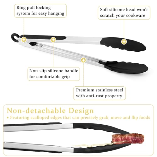 Premium Materials: Crafted with food grade silicone and premium stainless steel, no need to worry about breaking or rusting; Our kitchen tongs for cooking is healthy and sturdy for long-term use, Ideal as a housewarming gift for your friends and family
