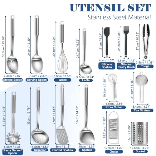 【PRACTICAL KITCHEN UTENSIL SET】Upgrade your kitchen with our 15-piece stainless steel cooking utensils set, designed to cover all your cooking and serving needs. This comprehensive kitchen utensils set includes essential tools like a Turner, Slotted Turner, Ladle, Skimmer, Serving Spoon, Slotted Spoon, Pasta Server, Whisk, Grey Retractable Tongs, Grater, Silicone Spatula, Silicone Basting Brush, Pizza Cutter, Tea Infuser, and a convenient Utility Bucket for organized storage.