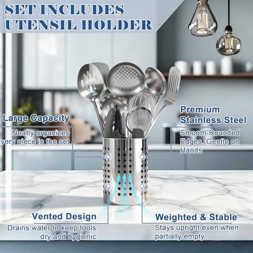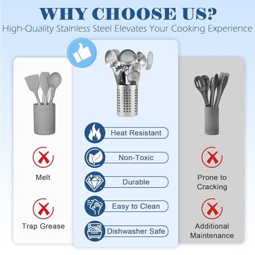 【PREMIUM STAINLESS STEEL】Crafted from premium stainless steel, this cooking utensils set is non-toxic, chemical-free, ideal for healthy meals. It resists high temperatures (great for searing, boiling, baking) and stays shiny, durable even after repeated use and dishwasher cycles.