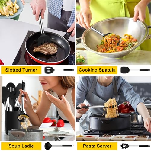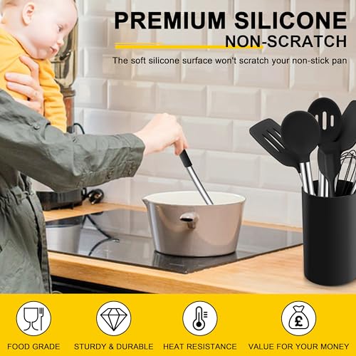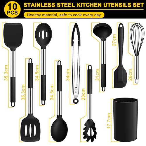 Joyfair Kitchen Utensils Set, 10 Pcs Silicone Cooking Utensils Set with Stainless Steel Handle, Heat Resistant Cooking Tools Spatula Turner Spoon with Holder, Dishwasher Safe & Non Scratch, Black