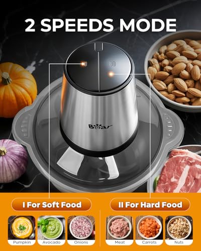 Bear Food Processor with 2 Bowls (1.8L+1.8L),500W Electric Food Chopper with 2 Sets of 304 Stainless Blades, 2 Speed Meat Grinder for Meat, Vegetables, Fruits and Nuts, BPA Free