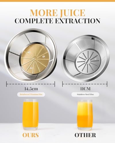 [Maximum Juice Yield]: With 14.5cm reinforced titanium disc can result in a more thorough extraction of juice from fruits and vegetables. Maximizing juice yield while minimizing waste. Ensures a 40% higher juice yield than other centrifugal juicers.