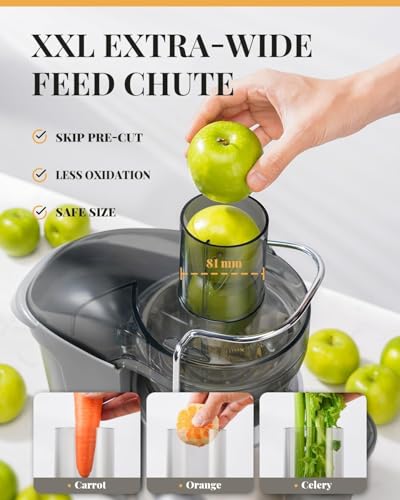 [81mm XXXL Feed Chute]: The juicer machines with an extra-large 81mm wide feed chute lets you easily add whole fruits and vegetables without precutting them into small pieces. Reduces prep time, allowing you to quickly juice your favorite ingredients.
