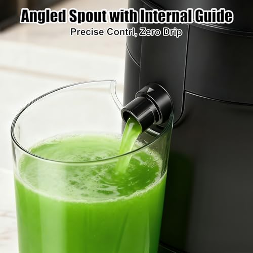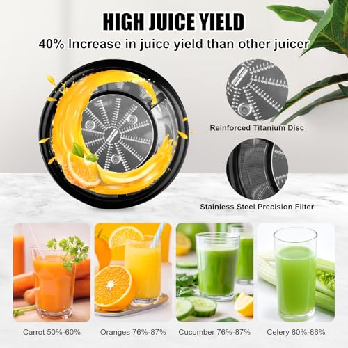 【More Juice & Unbeatable Efficiency】 Extract every last drop with our upgraded juicer machine. The enhanced titanium blade disc cuts through even hard fruits and vegetables with ease, while the precision micro-mesh stainless steel filter ensures optimum juice and nutrient extraction. The included juice jug features a built-in foam separator, letting you pour smooth juice with less clogging and froth.