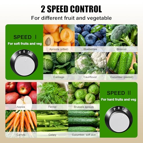 【Dual-Speed Juicing Control】 Customise your juicing with two speeds. “Ⅰ” for soft fruits like oranges or berries; “Ⅱ” for hard produce such as apples, carrots, celery, and kale. Whether you’re after a morning citrus mix or a green detox juice, this juicer machine delivers perfect results every time.